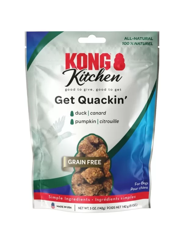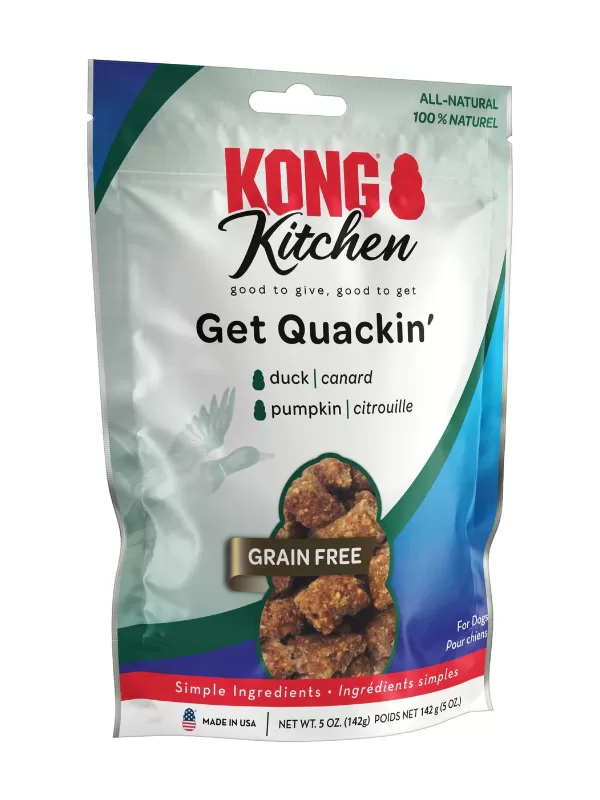 KONG Kitchen Grain-Free Get Quackin treats delight pups with premiere palettes: simple, wholesome, bite sized morsels of tasty duck and pumpkin, home baked by the brand you trust. Featuring out-of-the ordinary protein for special pups, these soft chewy squares deliver extraordinary flavor to lucky duck dogs.