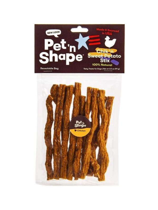 Pet n Shape Natural Chik n Sweet Potato Stix for dogs are 100% natural and contain real chicken and sweet potato. Chicken is a great source for lean protein and sweet potato is an excellent source of fiber, vitamins, and minerals. These treats are U.S. lab tested for safety and contain no artificial additives, colors, or preservatives. They are also free of any wheat, corn, and soy. Proudly made in the USA, these treats make a great snack for puppies, seniors or any size pup. Comes in a resealable bag for freshness.